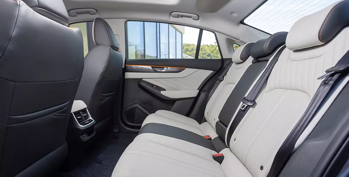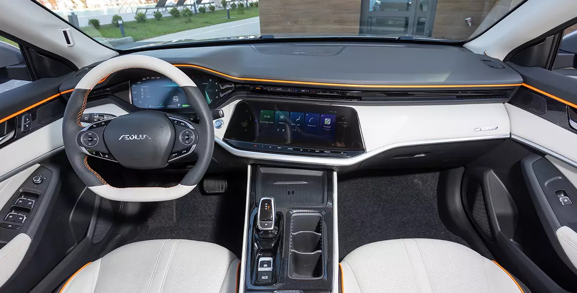 Комбинированный черно-белый салон Aeolus Shine Max с модными оранжевыми вставками радует текстурой и оформлением, но при более детальном знакомстве вызывает недоумение. И дело тут совсем не в том, что из живых клавиш в салоне здесь только кнопка запуска и выключения двигателя. К сенсорам всеядный русский человек привыкнет так же быстро, как к засилью китайских автомобилей в стране. Но вот к отсутствию возможности вручную регулировать дефлекторы системы кондиционирования — отнюдь. Управлять потоками воздуха здесь положено через 12,3-дюймовый тачскрин головного устройства, чей интерфейс еще и забавляет огрехами перевода.